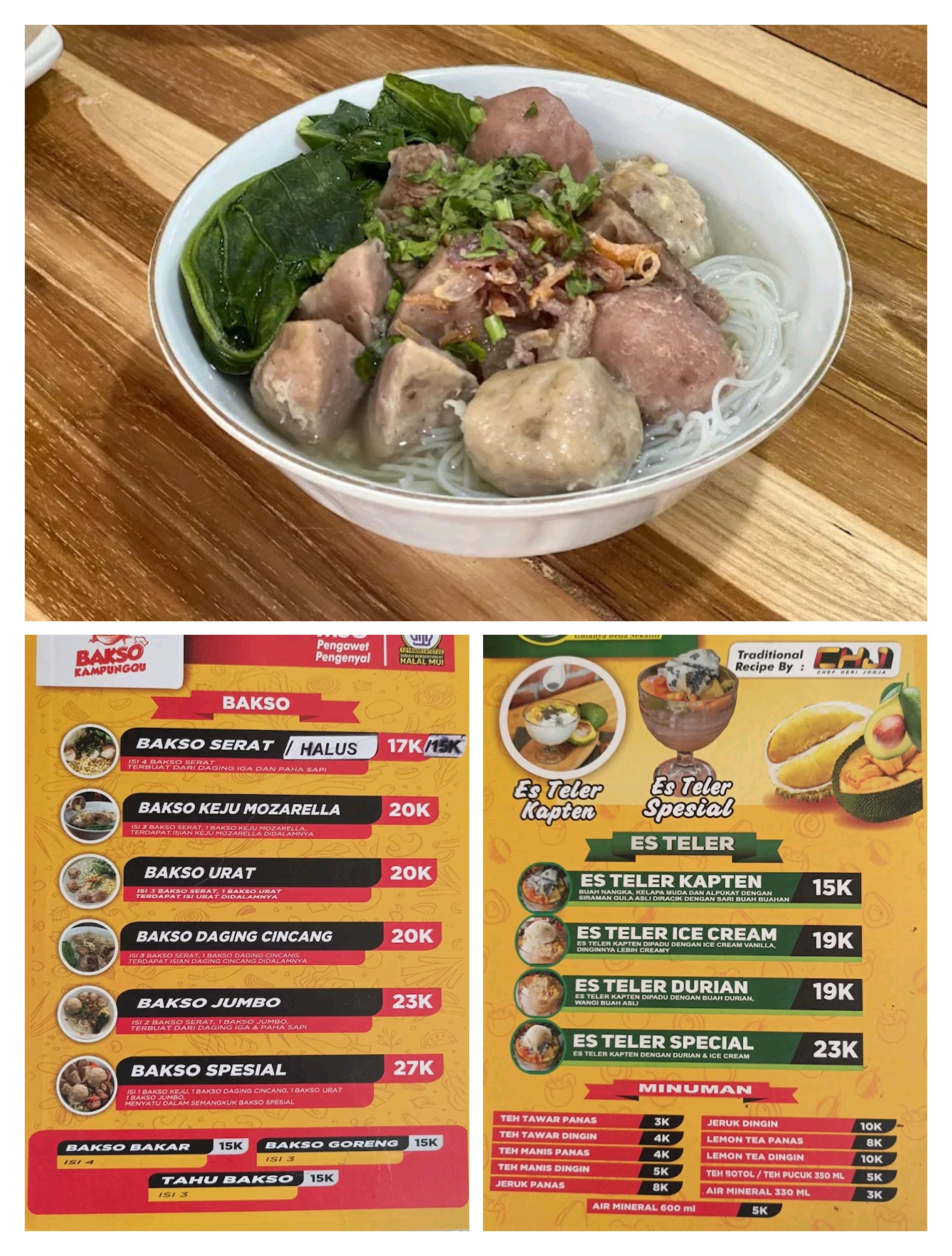 Ada juga es teler duren yang juara! Wajib banget sih kamu buat kesini, selain tempatnya enak buat makan bakso, rasanya yang enak dan murah meriah juga nih! Esnya mulai dari 15 ribu – 23 ribu, bakso mulai dari 17 ribu – 27 ribu.