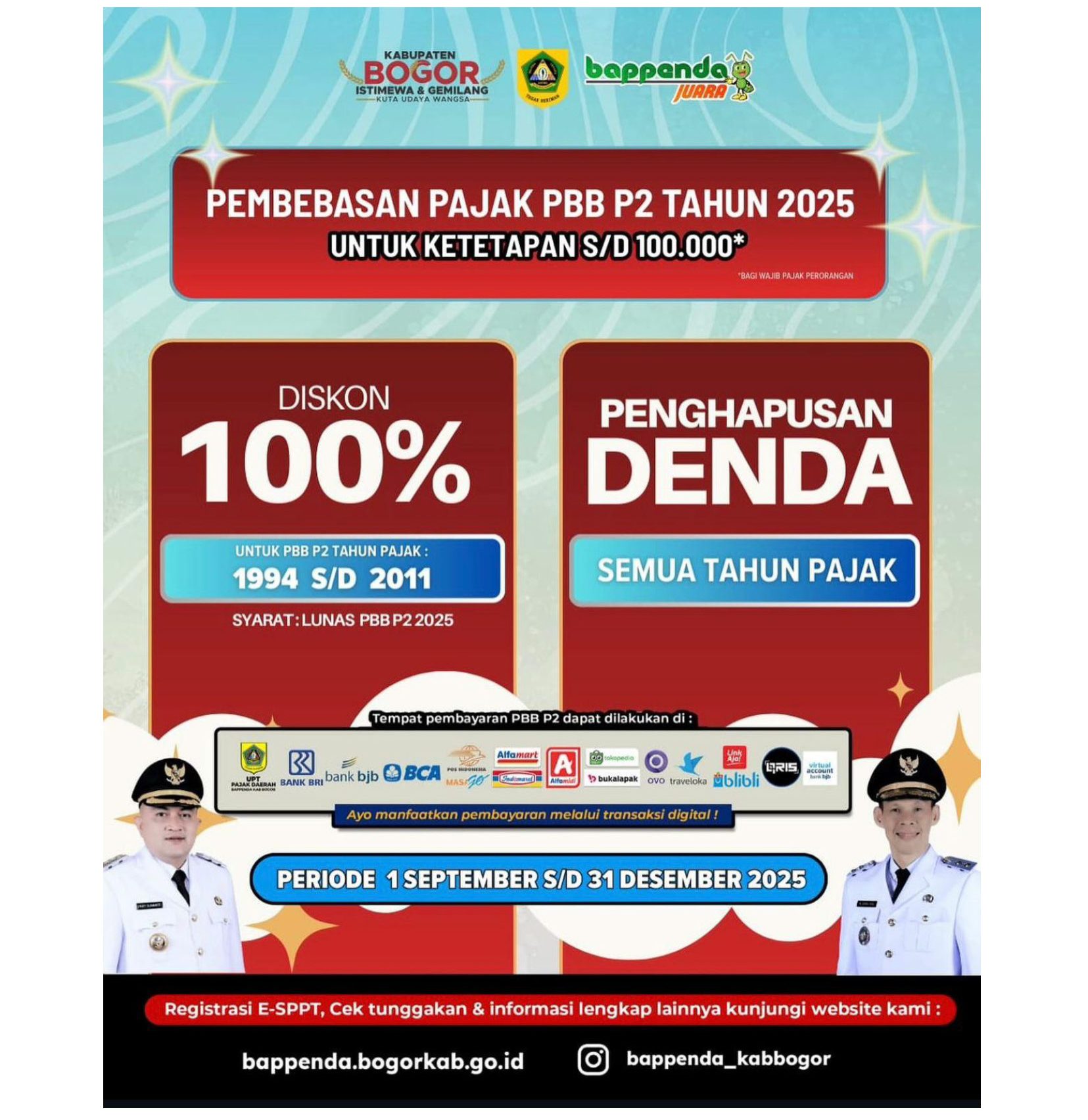 Mulai 1 September hingga 31 Desember 2025, masyarakat dapat memanfaatkan diskon 100% untuk PBB P2 tahun pajak 1994 hingga 2011, asalkan telah melunasi PBB P2 tahun 2025. Untuk wajib pajak yang nilai ketetapan pajaknya maksimal Rp100.000,- Pemerintah Kabupaten Bogor memberikan pembebasan penuh: pajak dianggap langsung lunas untuk tahun 2025 tanpa perlu melakukan pembayaran lagi dan kebijakan ini berlaku tanpa batas waktu.