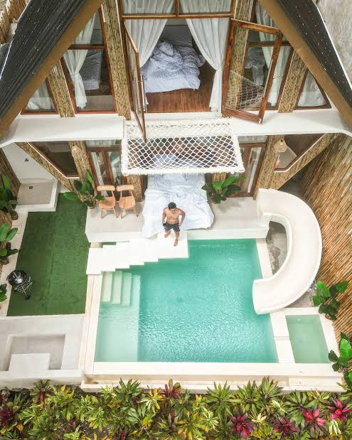 Vila ini uniknya dilengkapi kasur berukuran besar yang dapat digeser hingga ke sisi kolam renang Lho! Ih seru banget ya kan.