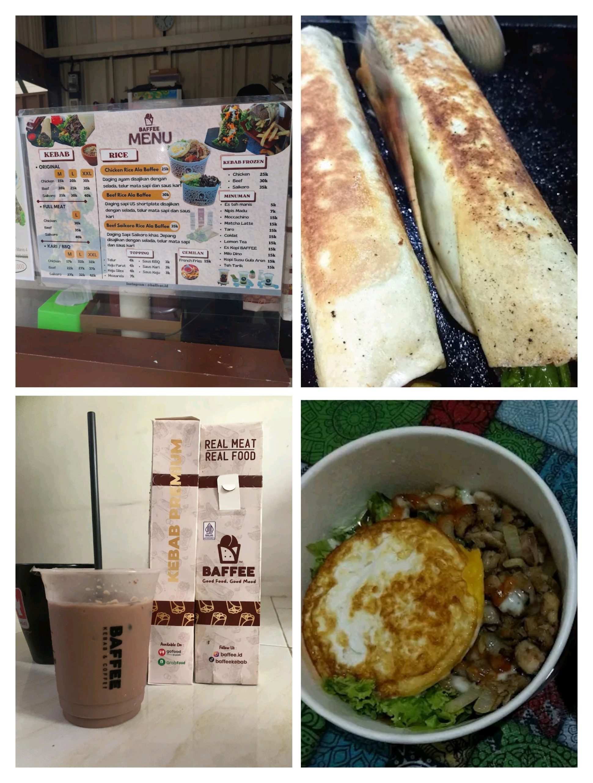 Beberapa menu di Baffee beragam, mulai dari Kebab Original, Full Meat, hingga varian Saus Kari atau BBQ. Harga pun variatif, berkisar Rp15.000 hingga Rp40.000 untuk varian medium hingga large.