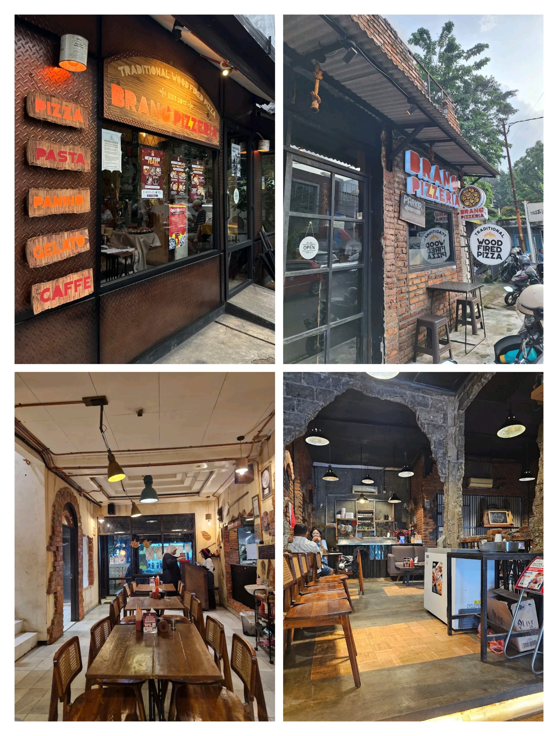 Saat memasuki Brano Pizzeria, interior Brano mengusung konsep rustic industrial dengan dinding bata merah terbuka, punya suasana hangat dan estetik